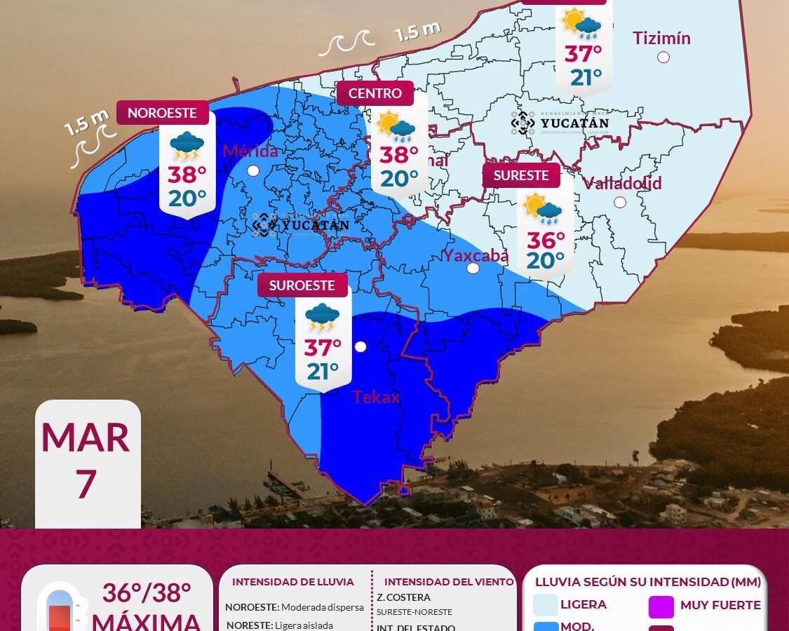 Suscríbete a nuestro canal Para este sábado 7 de marzo, continuaremos con la presencia de lluvia ligera y moderada dispersa sobre el estado de Yucatán, la cual se registrará a partir de las 13:00 horas en municipios como Tizimín, Tixcacalcupul, Chichimilá, Yaxcabá, Tunkás, Cenotillo, Tekax, Peto, Tzucacab y después de las 14:00 horas, en municipios […]