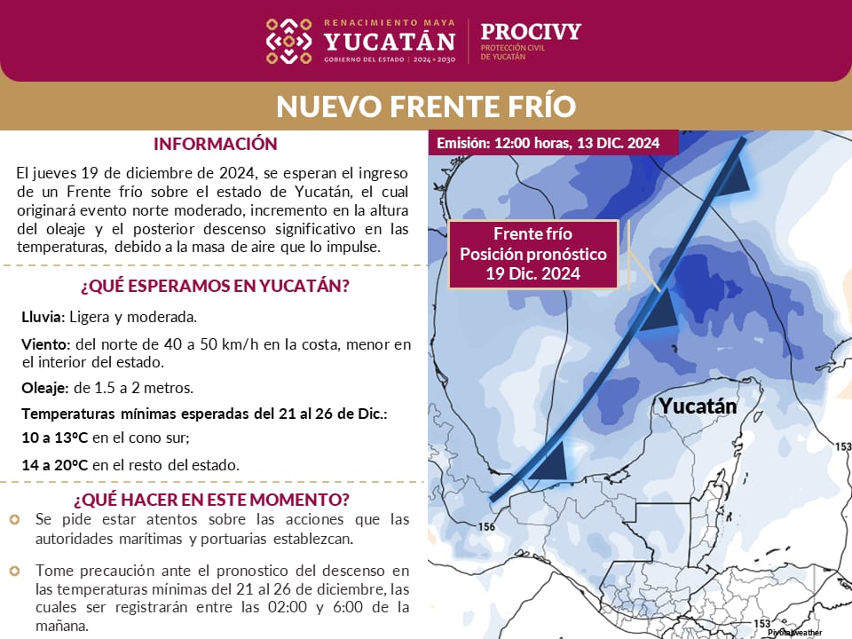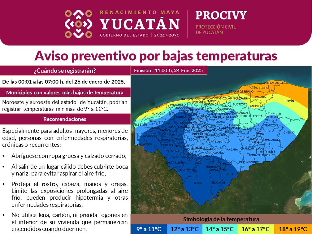 La madrugada de este domingo 26 de enero, el termómetro descenderá significativamente en Yucatán debido a la masa de aire ártico que acompaña al Frente Frío No. 24. La Coordinación Estatal de Protección Civil (Procivy) informó que se esperan temperaturas mínimas de entre 9°C y 11°C en varios municipios de la entidad. Entre los municipios […]
