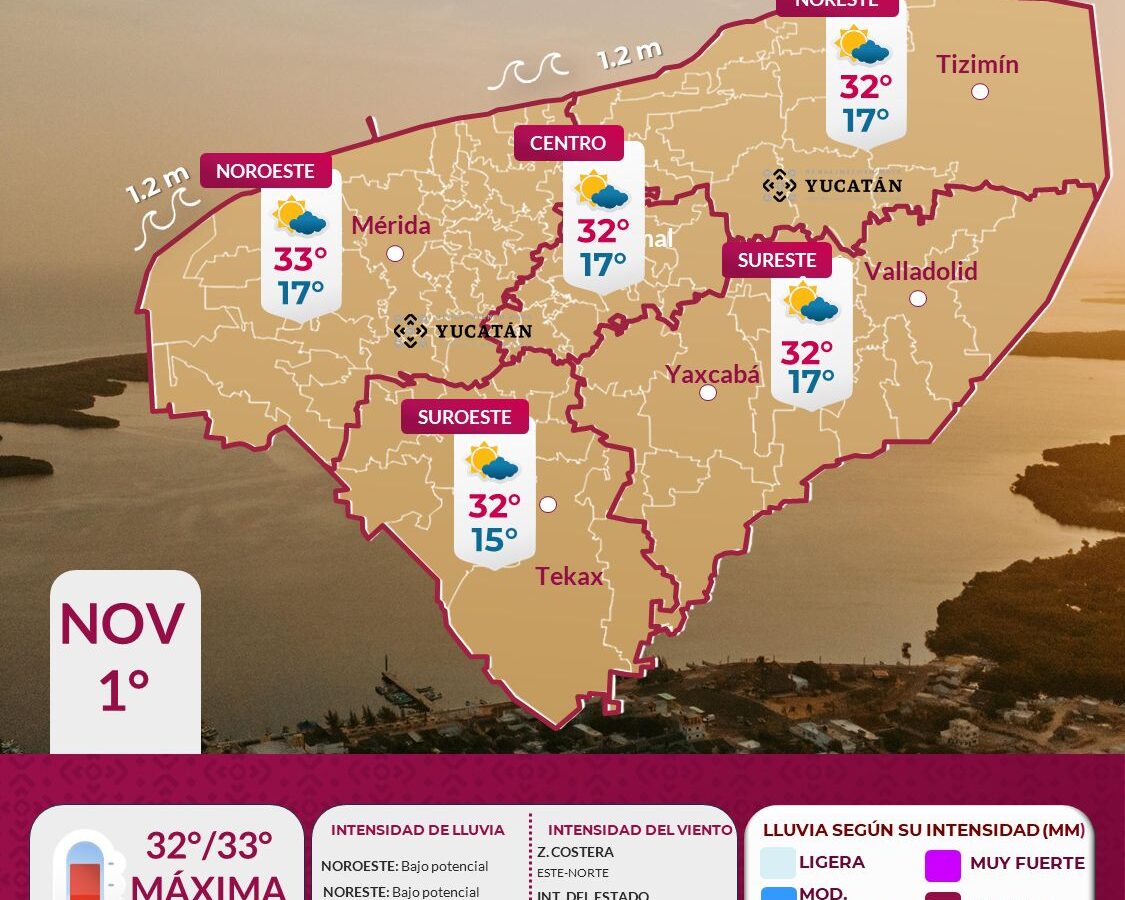 Para este sábado 1° de noviembre, en el estado de Yucatán prevalecerá ambiente cálido en el día y fresco por la noche y el amanecer; se espera temperatura máxima de 32°a 33°C en el interior del estado y de 27° a 29°C en la zona costera. No se espera lluvia.