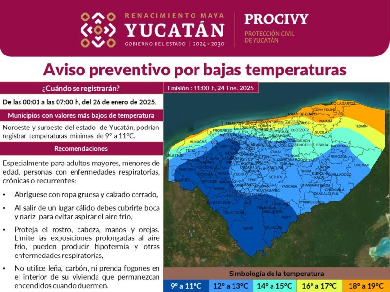 Publicado enYucatánProcivy alerta sobre descenso de temperaturas en Yucatán este domingo por 24 Horas Yucatán enero 24, 2025enero 24, 2025
