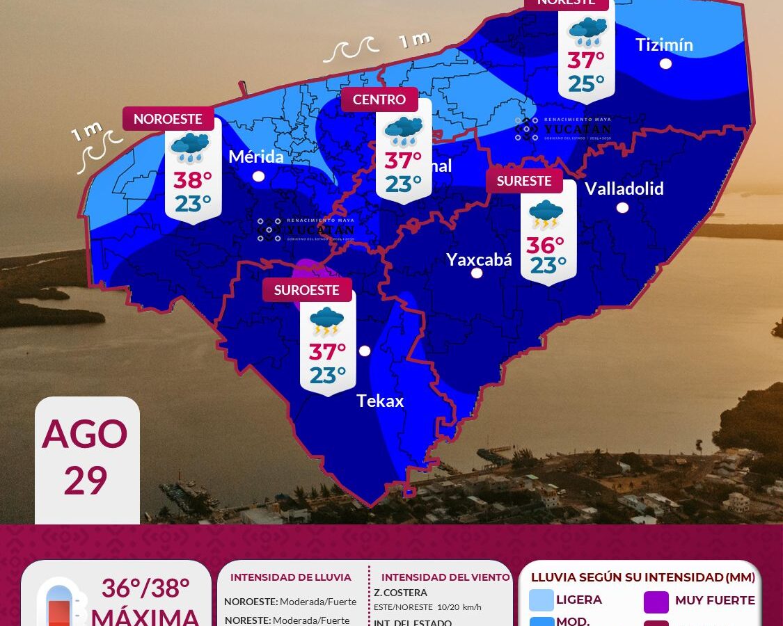 Para este viernes 29 de agosto, el ingreso de aire marítimo tropical procedente del Mar Caribe y del Golfo de México, favorecerá la presencia de lluvia ligera dispersa por la mañana en algunos municipios de Yucatán; a partir de las 13:00 horas se registrará de intensidad moderada a fuerte en municipios del noreste y noroeste; […]