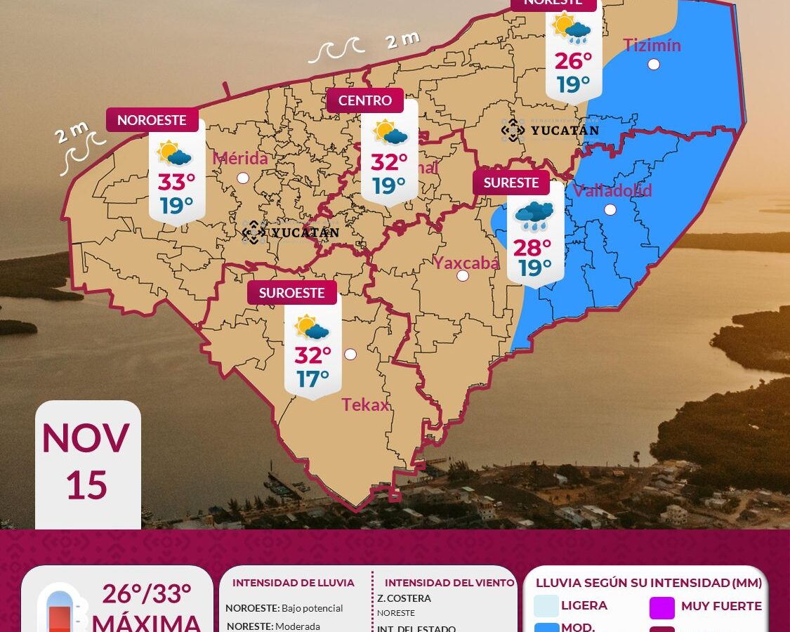 ¡Únete a nuestro canal de WhatsApp! Para este sábado 15 de noviembre, el ingreso de aire marítimo, favorecerá ambiente cálido en el día y fresco por la noche y el amanecer; así mismo, se espera lluvia moderada por la tarde en municipios del noreste y sureste. La temperatura máxima será de 26° a 33°C en […]