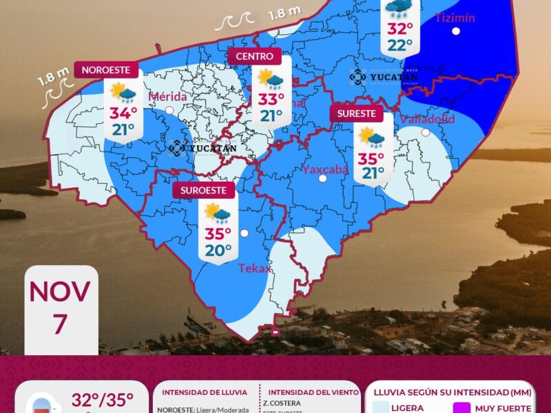 Para este sábado 8 de noviembre, el ingreso de aire marítimo tropical y el establecimiento de una vaguada, favorecerán la presencia de lluvia moderada acompañada de rachas de viento y actividad eléctrica en Tizimín, Valladolid y municipios aledaños; mientras que en Sucilá, Cenotillo, Homún, Abalá. Mérida, Halachó, Hunucmá y aledaños, se registrará de intensidad ligera […]