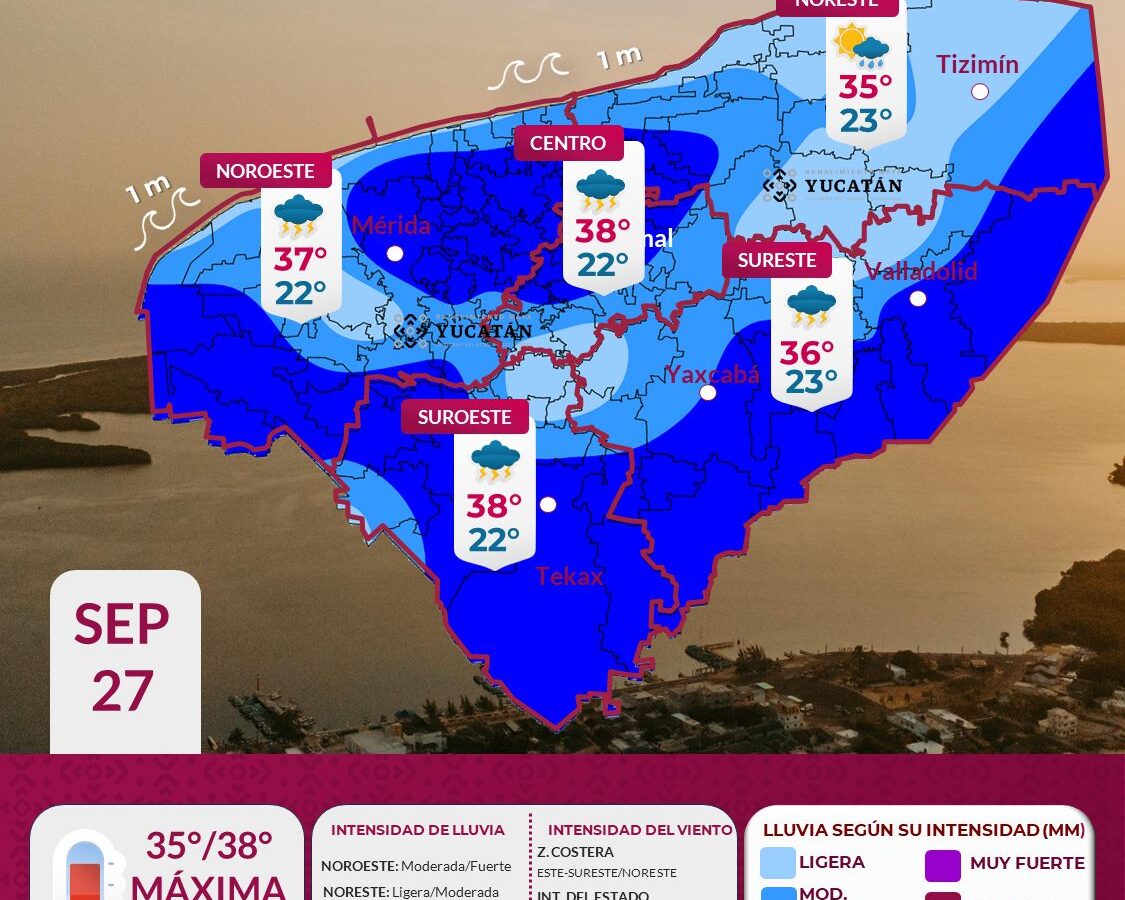 Para este sábado 27 de septiembre, debido al ingreso de aire marítimo tropical procedente del Mar Caribe y Golfo de México, se espera lluvia ligera y moderada dispersa después del mediodía; y de mayor intensidad entre las 15:00 y 18:00 horas en los municipios del noreste y noroeste del estado; mientras que en el sureste […]