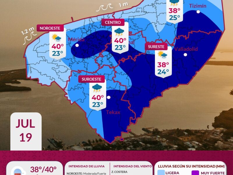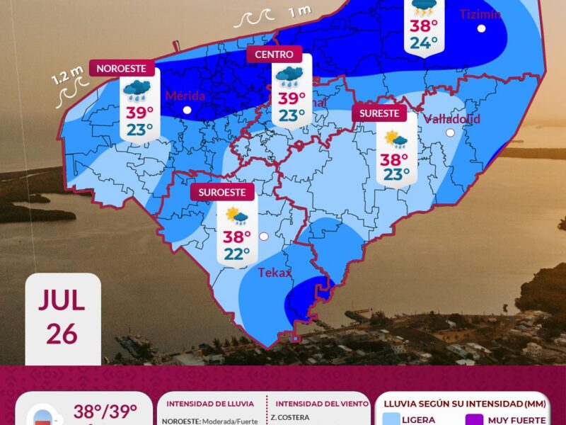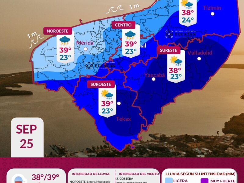 Para este viernes 26 de septiembre, el establecimiento de una vaguada en superficie y el ingreso de aire marítimo tropical procedente del Mar Caribe y Golfo de México, favorecerán la presencia de lluvia vespertina en el estado de Yucatán; de intensidad ligera en los municipios del noreste y de moderada a fuerte acompañada de rachas […]