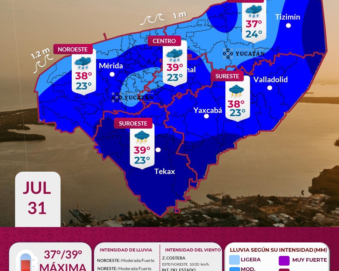 Este jueves 31 de julio, la Onda Tropical No. 18 provocará lluvias en Yucatán, con intensidad que irá desde ligera por la mañana hasta moderada y fuerte en horas de la tarde, principalmente en municipios del noreste, centro y noroeste del estado. En tanto, las zonas del sureste y suroeste tendrán lluvias moderadas y dispersas, […]