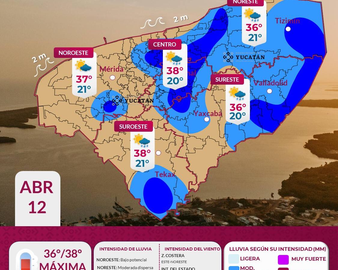 Suscríbete a nuestro canal Para este domingo 12 de abril, continuará el ingreso de aire marítimo tropical procedente del Mar Caribe y el establecimiento de una vaguada sobre la Península de Yucatán, la interacción de estos sistemas favorecerá la presencia de lluvia moderada dispersa por la tarde sobre los municipios del noreste, centro, sureste y […]
