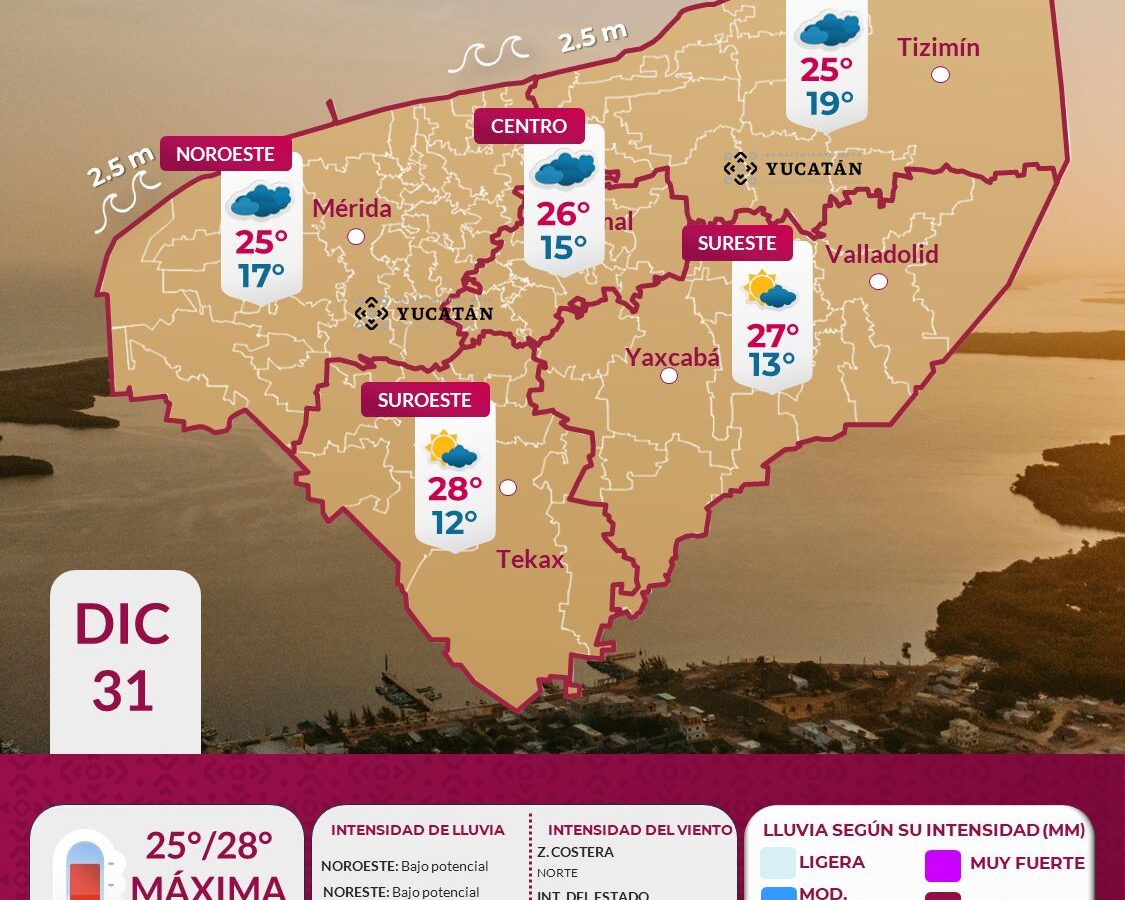 Para este miércoles 31 de diciembre, debido a los efectos de la masa de aire ártico asociada al Frente Frío No. 25, predominarán los nublados por la mañana con soleados parciales, con ambiente fresco durante el día con temperaturas máximas de 25 a 28°C y frío por la noche y el amanecer, con valores de […]