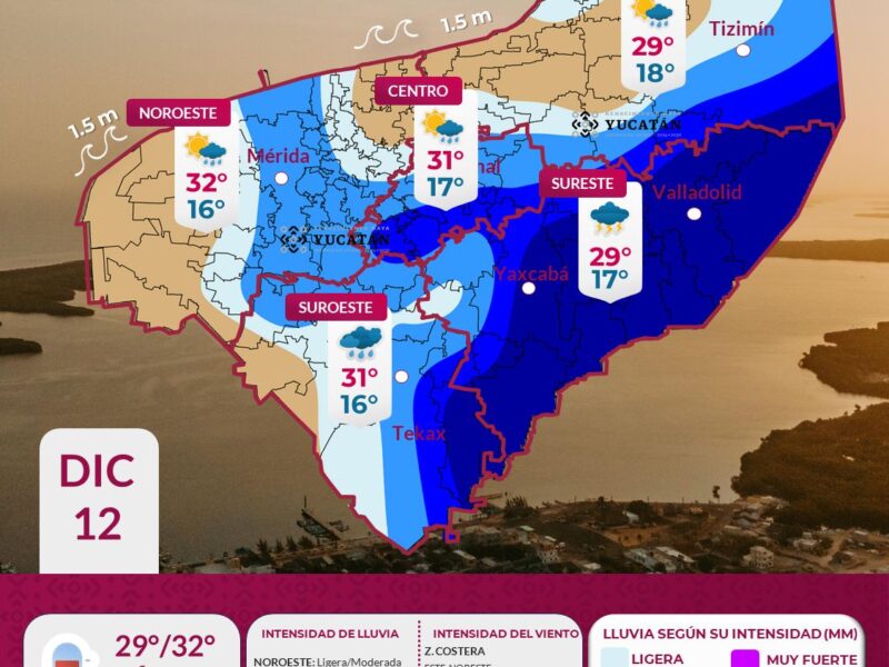 Para este sábado 13 de diciembre, debido al ingreso de humedad proveniente del Mar Caribe y el establecimiento de una vaguada, se espera lluvia ligera por la mañana y fuerte en el transcurso del mediodía en municipios del noreste, noroeste y centro de Yucatán, incluidos Tizimín, Mérida e Izamal. Se espera lluvia moderada y fuerte […]