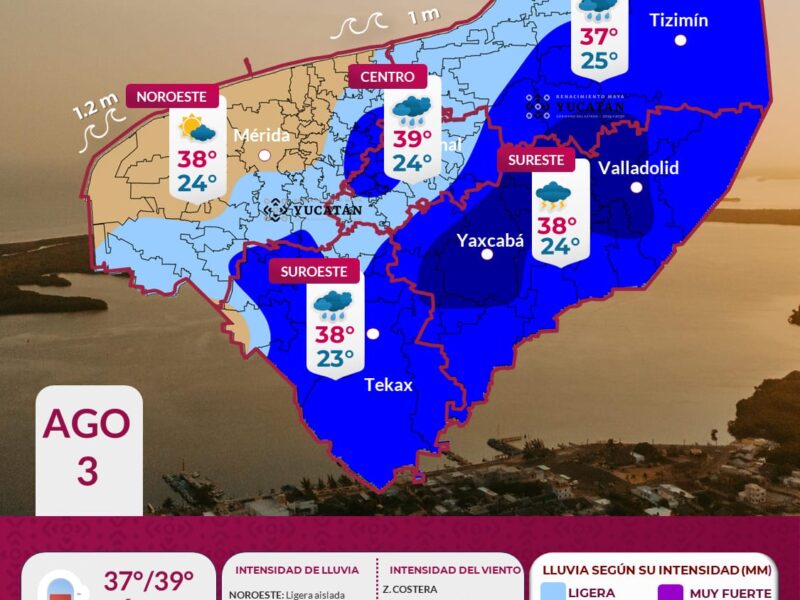 Publicado enYucatánPronóstico: lluvias fuertes y calor en Yucatán por 24 Horas Yucatán agosto 3, 2025agosto 3, 2025