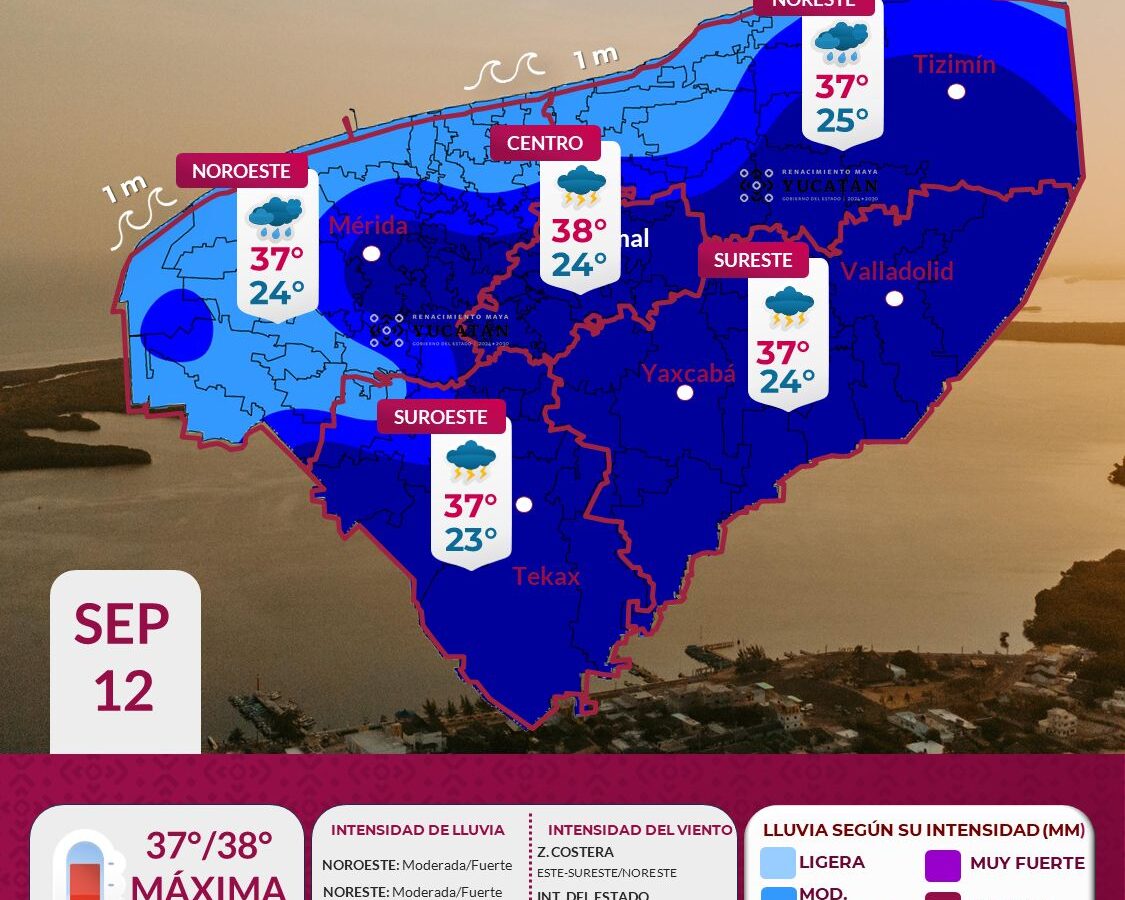 Para este viernes 12 de septiembre, debido al ingreso de humedad proveniente del Mar Caribe y del Golfo de México, así como por el establecimiento e influencia de vaguadas, continuará la presencia de lluvia moderada y fuerte acompañada de rachas de viento y actividad eléctrica a partir del mediodía en los municipios del noreste y […]