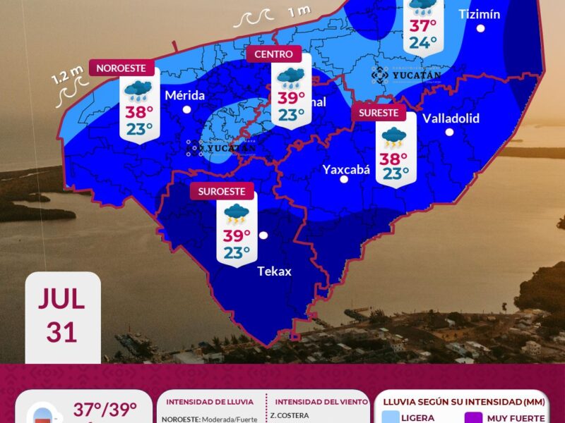 Publicado enYucatánPronóstico: lluvias fuertes y calor en Yucatán por 24 Horas Yucatán agosto 3, 2025agosto 3, 2025