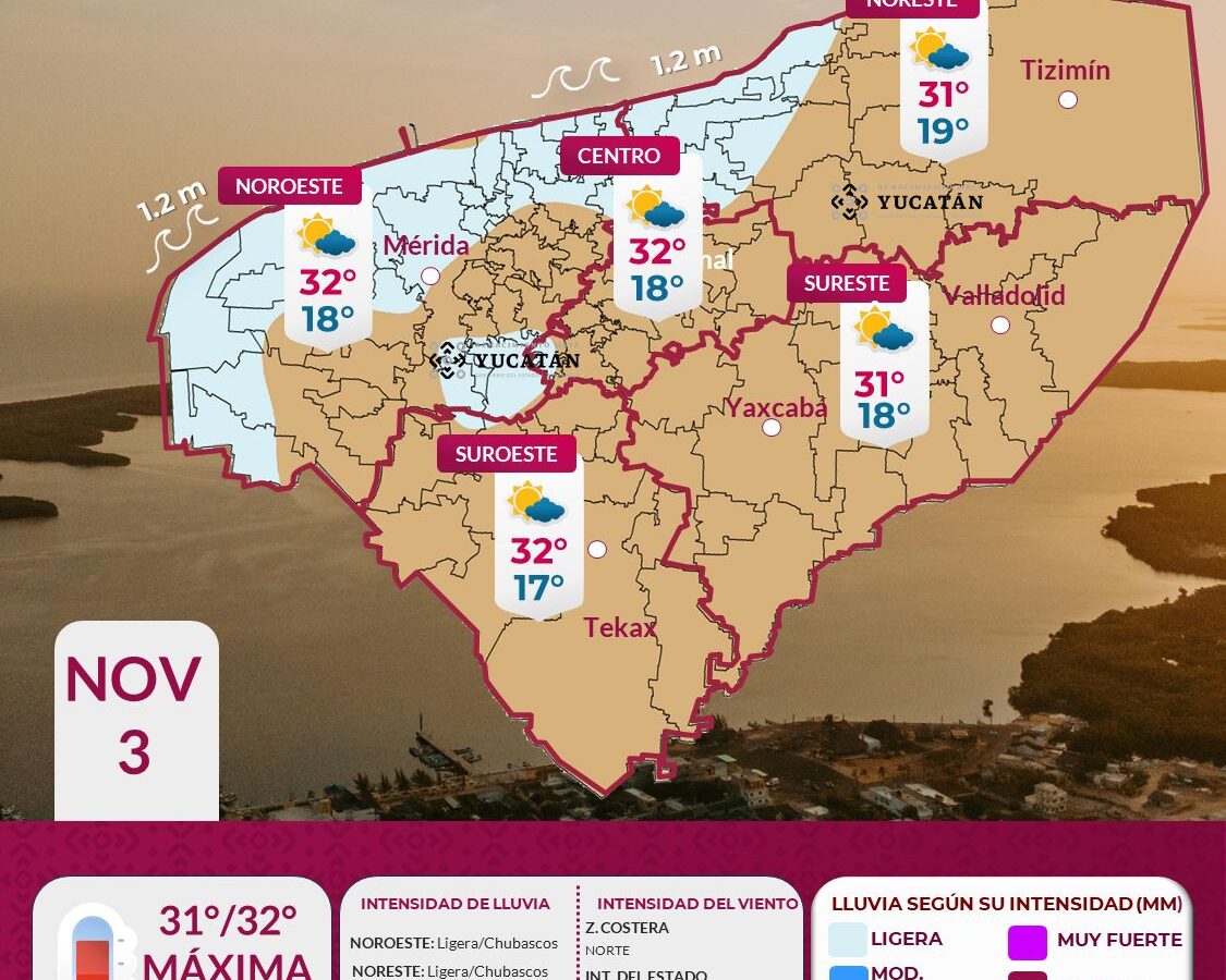 Para este lunes 3 de noviembre, en el estado de Yucatán continuáremos con los efectos del Frente Frío No. 12 (débil), originará viento del norte de 25 a 35 km/h en la zona costera y de 15 a 25 km/h en el interior del estado, el ambiente será cálido durante el día con una temperatura […]