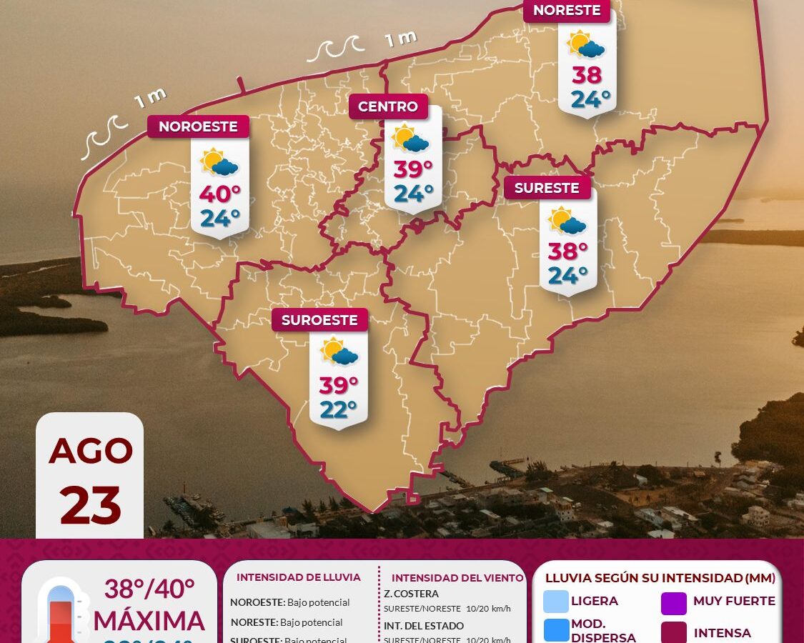 Para este sábado 23 de agosto, en el estado de Yucatán predominará cielo mayormente soleado, ambiente muy caluroso con temperaturas máximas de 38 a 40°C en el interior del estado y de 32 a 34°C en la zona costera. El potencial de lluvia es bajo sin descartar algún chubasco aislado hacia el final de la […]