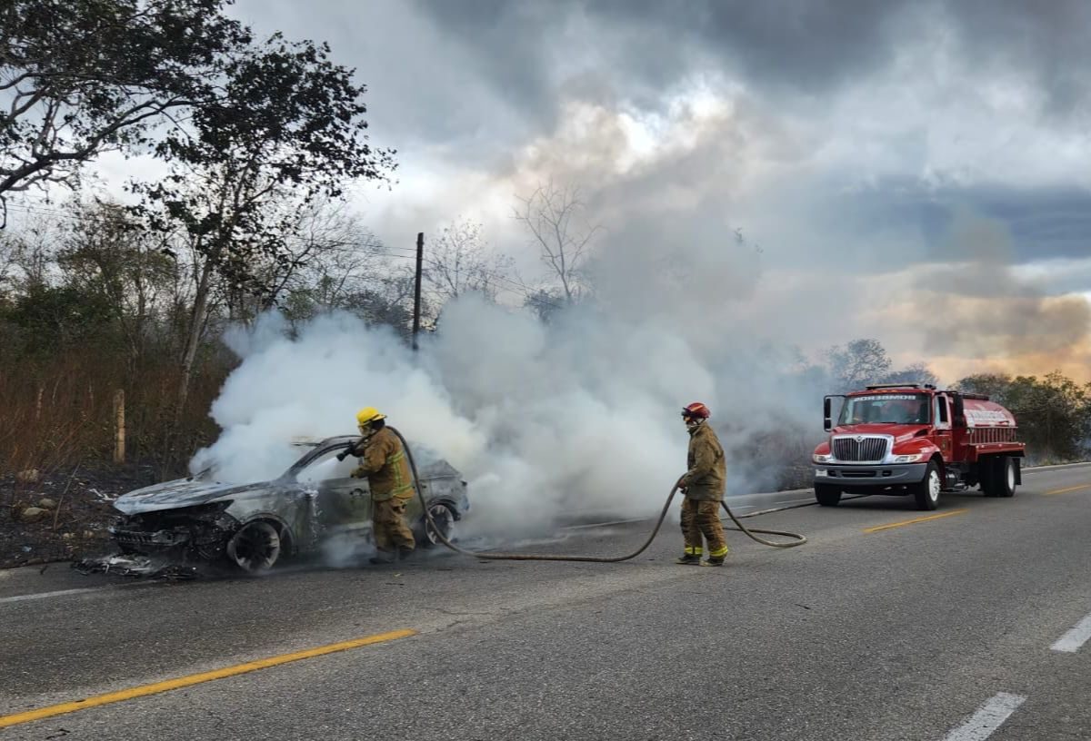 Incendio por cortocircuito en vehículo en la carretera Muna, Umán