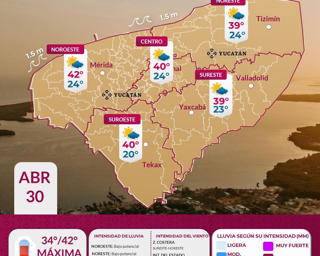 Suscríbete a nuestro canal Para este jueves 30 de abril, continuará la influencia de un sistema de alta presión, el ingreso de aire marítimo tropical y el establecimiento de una vaguada sobre la Península de Yucatán, lo cual favorecerá ambiente cálido al amanecer, registrándose temperatura mínima entre los 22 y 25°C, mientras que durante el […]