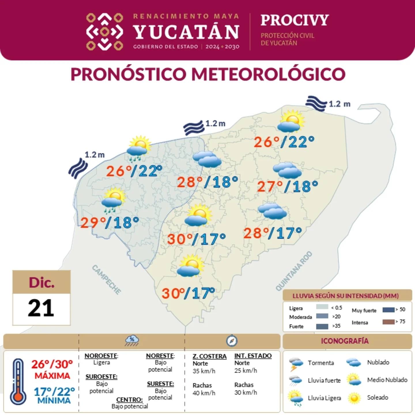 Publicado enYucatánEl clima para este sábado: Nublados, Lluvias y Chubascos por 24 Horas Yucatán diciembre 21, 2024diciembre 21, 2024