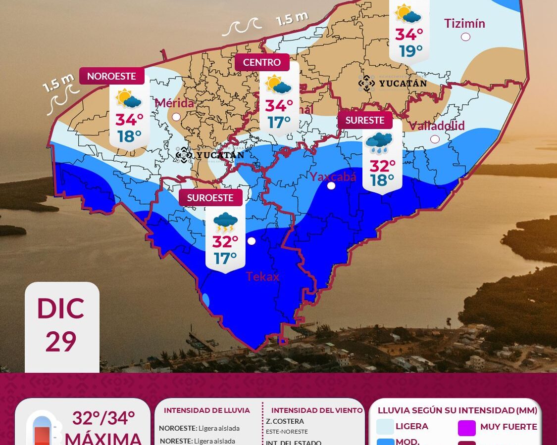 Para este lunes 29 de diciembre, debido al ingreso de humedad proveniente del Mar Caribe y del Golfo de México, así como por la influencia de una vaguada, se espera lluvia moderada y puntualmente fuerte por la tarte en municipios del suroeste y sureste del estado; y ligera aislada en el centro, noreste y noroeste. […]