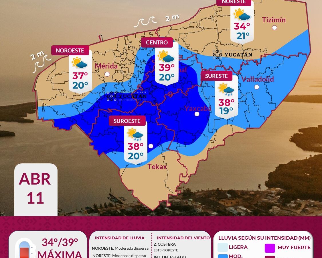 Suscríbete a nuestro canal Para este sábado 11 de abril, el ingreso de aire marítimo tropical procedente del Mar Caribe y el establecimiento de una vaguada sobre la Península de Yucatán, favorecerán la presencia de lluvia moderada acompañada de rachas de viento y actividad eléctrica, después de las 13:00 horas en municipios del oriente del […]