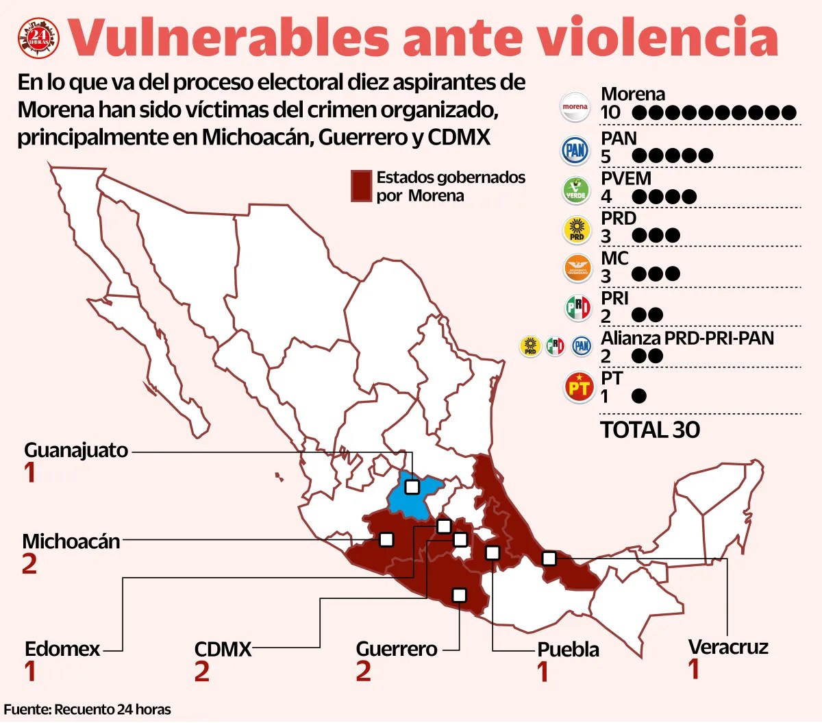 Durante el actual proceso electoral, Morena es el partido que más aspirantes o candidatos asesinados registra, con diez de las 30 víctimas, de las cuales, nueve fueron asesinadas en estados gobernados por la cuarta transformación, de acuerdo con un recuento que realizó este diario. Michoacán, Ciudad de México y Guerrero son los tres estados con más casos -dos, cada uno-. […]