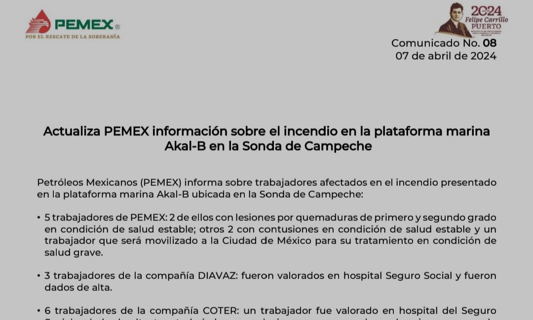 En un trágico incidente ocurrido en la plataforma marina Akal-B, ubicada en la Sonda de Campeche, Petróleos Mexicanos (PEMEX) confirmó el fallecimiento de un trabajador de la compañía COTER, así como la condición grave de dos más, uno de la misma empresa y otro perteneciente a PEMEX. La explosión afectó a un total de 14 […]