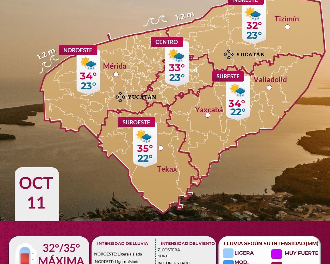 Suscríbete a nuestro canal Para este sábado 11 de octubre, debido al ingreso de aire marítimo procedente del Golfo de México, en Yucatán se espera ambiente cálido a caluroso en el día, con temperatura máxima de 32 a 35°C en el interior del estado y de 29° a 31°C en el litoral yucateco. Aunque el […]