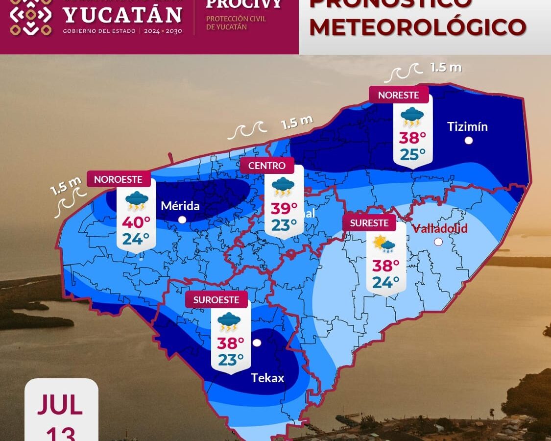 La Coordinación de Protección Civil de Yucatán informó que este domingo 13 de julio se prevé un día muy caluroso, con temperaturas que podrían alcanzar los 40 °C en el noroeste del estado. En municipios del centro, como Mérida, se espera una máxima de 39 °C, mientras que en el noreste, sureste y suroeste se mantendrá alrededor […]